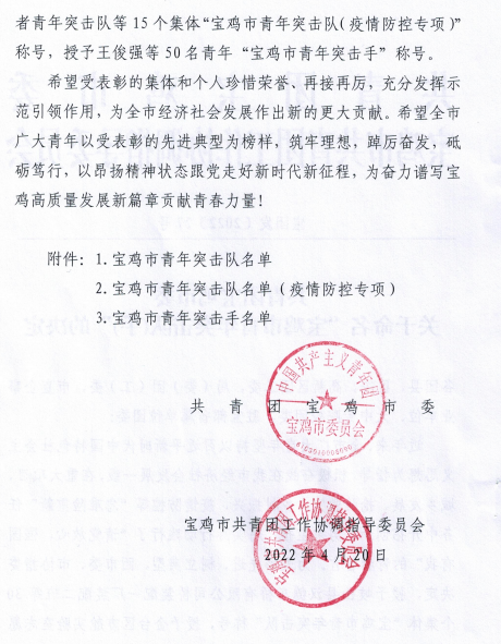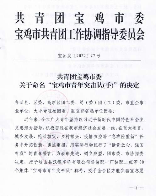 近日,从团市委获悉,宝光股份固封班组被授予“宝鸡市青年突击队”荣誉称号。