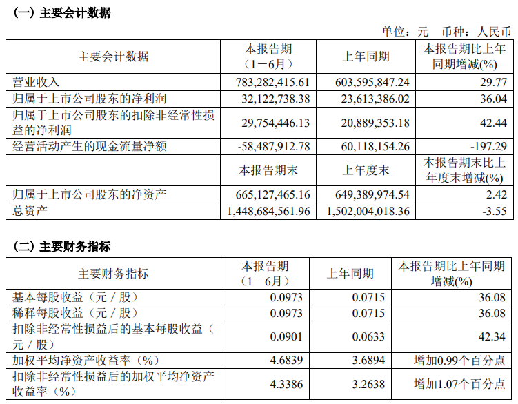 宝光股份2023年半年度主要财务指标