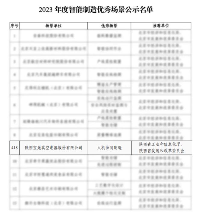近期,工业和信息化部公布了“2023年度智能制造示范工厂揭榜单位和优秀场景名单”,宝光股份申报的《真空灭弧室关键零件智能生产线》项目顺利入选智能制造示范优秀场景,标志着宝光股份智能制造水平迈上新台阶。