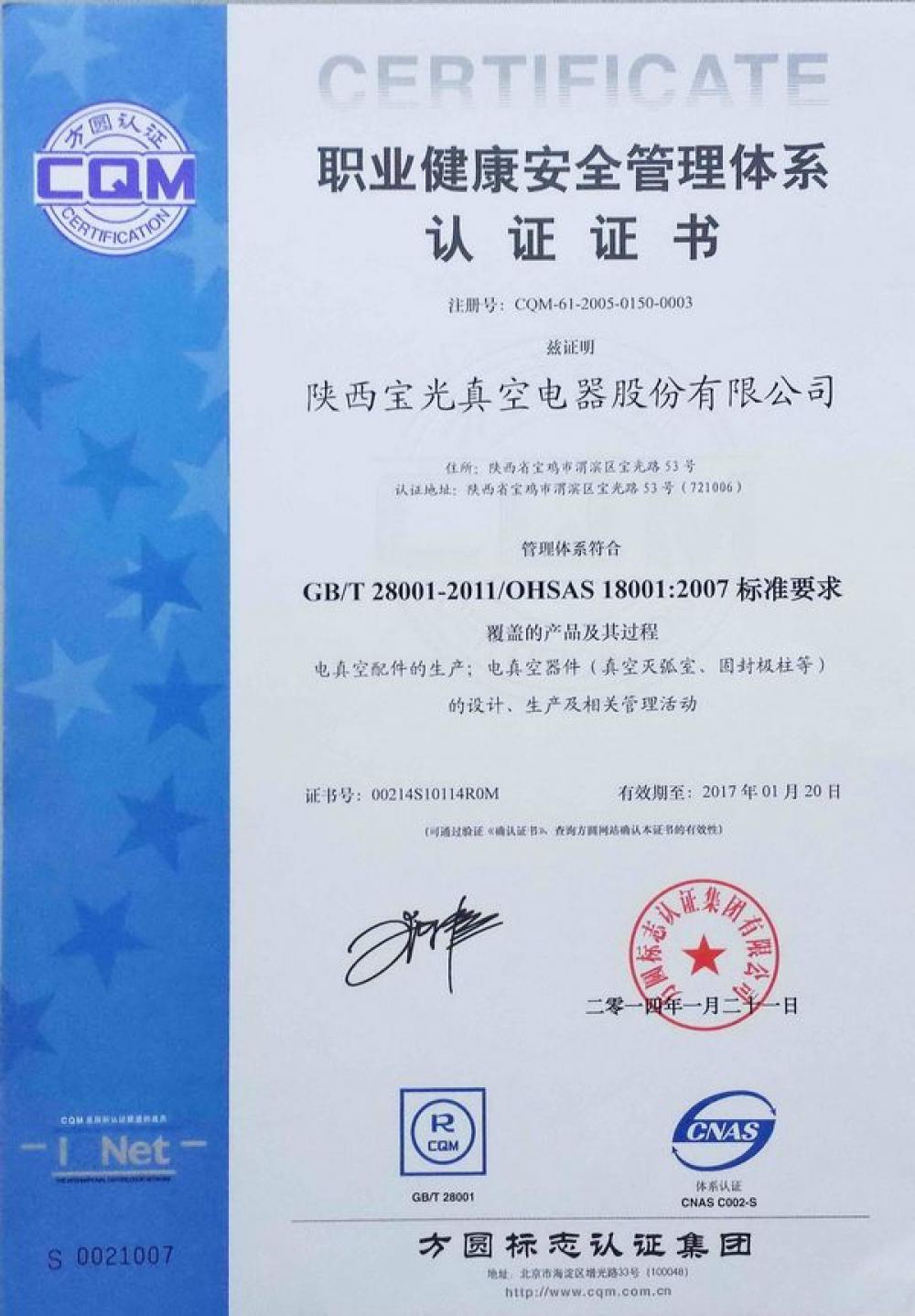 - 2014年通过OHSAS 18001:2007职业健康安全管理体系认证